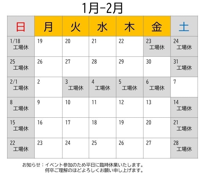 2月3日(火)~6日(金)はイベント参加のため、誠に勝手ながら臨時休業とさせていただきます。