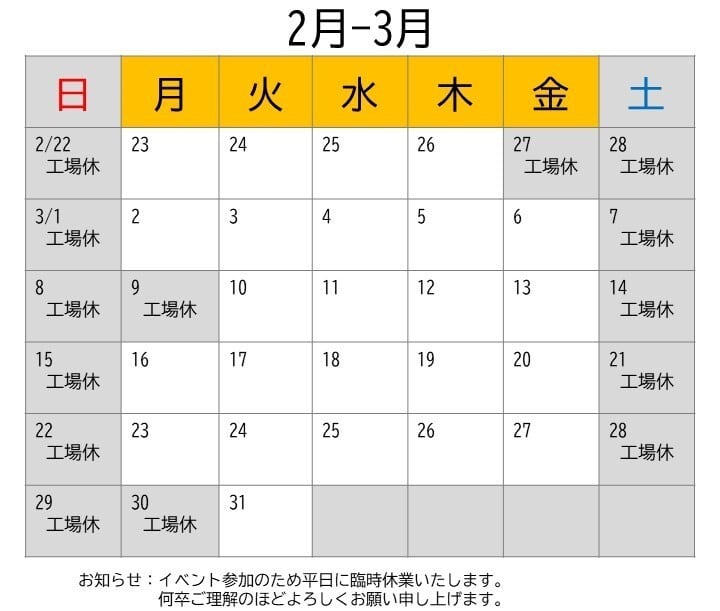 2026年2月~2026年3月のオンラインショップ営業カレンダーです。